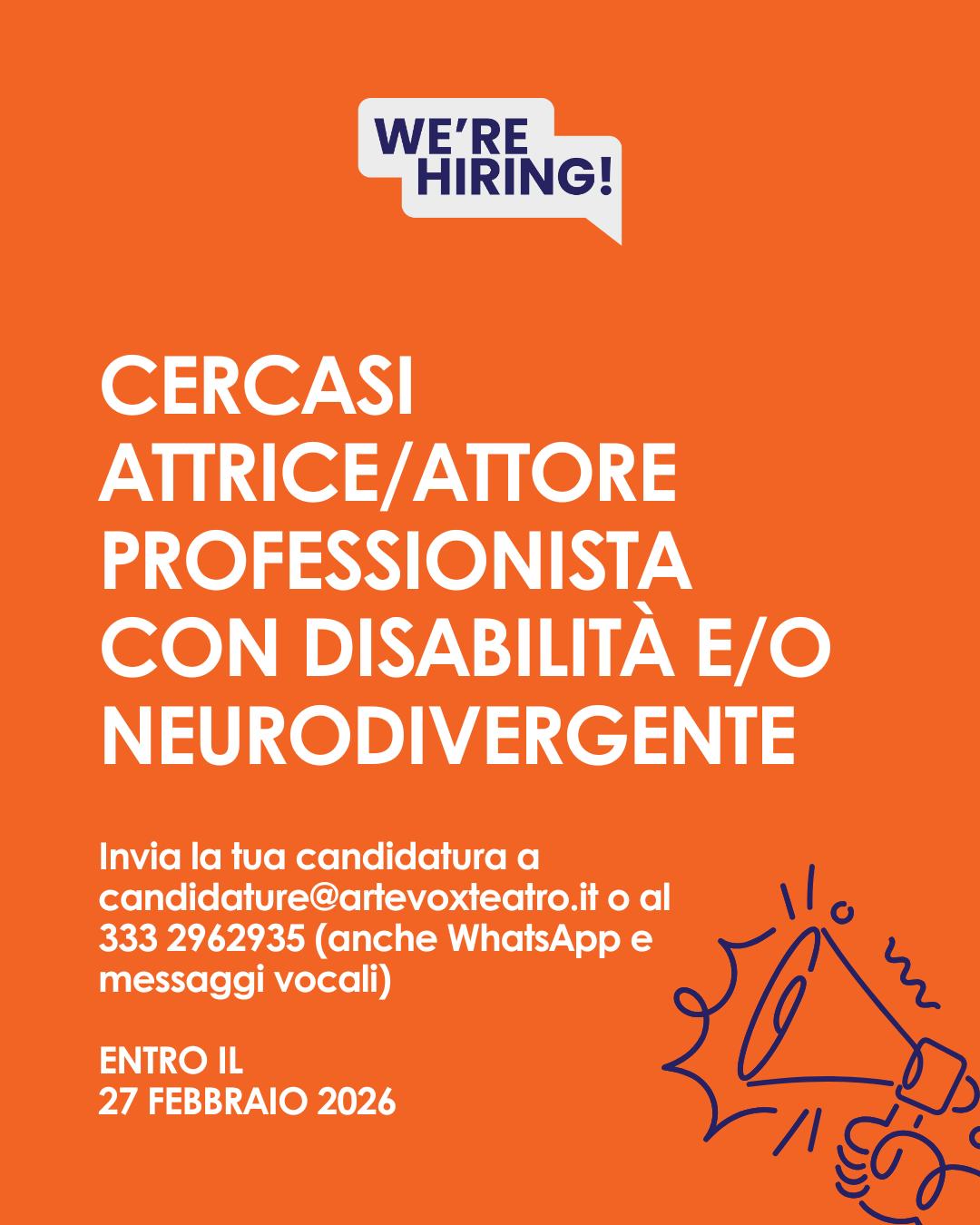 ArteVOX Teatro (www.artevoxteatro.it) cerca un/una attore/attrice professionista con disabilità e/o neurodivergente.